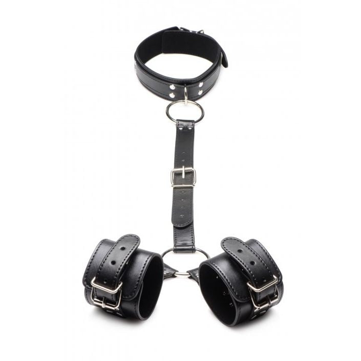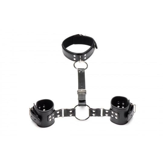Hook your fingers around the O-rings and tug your lover towards you. Play with attaching the O-rings to different anchor points or place their hands far away from them. Their wrists will be cuffed and restrained, the center strap attached to their collared neck. Keep the center strap short to keep their hands just out of reach of their genitals so they can t play with themselves, and enjoy teasing and toying with them. Limit their movement even more by bringing the strap around to the back and placing their restrained wrists behind their back.